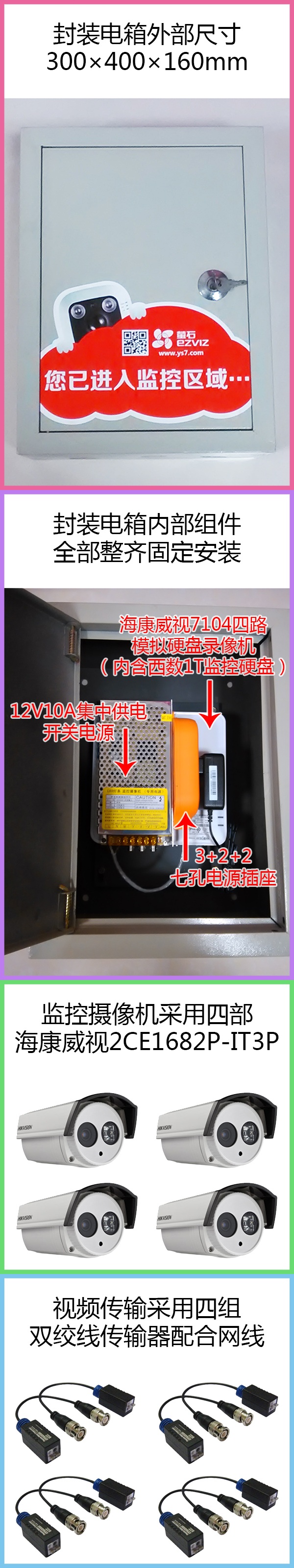 四路監(jiān)控套裝,內(nèi)含7104四路模擬硬盤錄像機(jī)一臺(tái)、西數(shù)1T監(jiān)控硬盤一塊、2V10A集中供電開(kāi)關(guān)電源一個(gè)、3+2+2七孔電源插座一只、400×300×160mm電箱一個(gè)、監(jiān)控?cái)z像機(jī)四部、雙絞線傳輸器四組、12V電源公頭四支、純銅網(wǎng)線50米及攝像機(jī)支架四支,僅售人民幣1299元,徐州市三環(huán)路以內(nèi)1799元上門包安裝,另加700元可得19寸顯示器及顯示器墻面掛架一套。